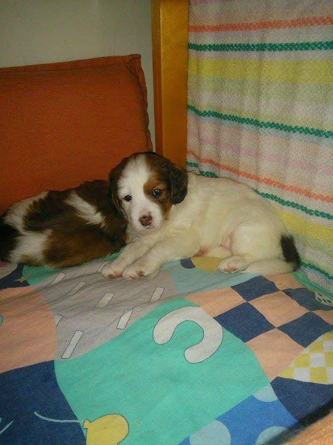 Tänään pojat ovat uudessa yksiössään jo ihan kuin kotonaan. Poistumisen itsenäisesti on hoksannut Blondi, joka kiipesi pois eilen illalla, ja yölläkin se kävi minun vieressäni seikkailemassa kun kumminkin päätin vielä nukkua pentujen vieressä varmuuden vuoksi (kun on uusi "kotikin").